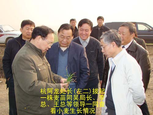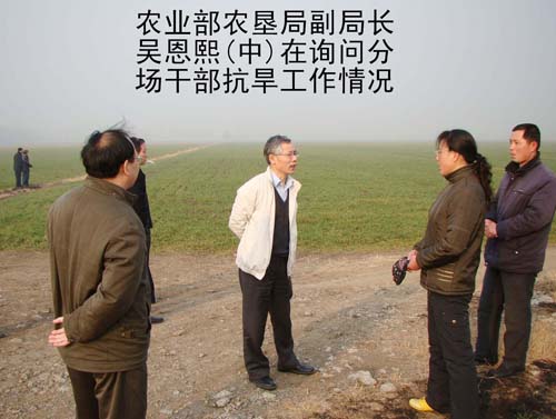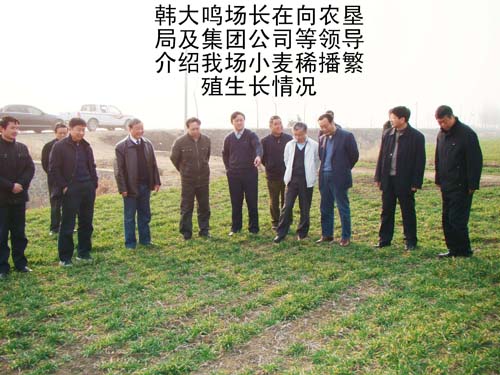 2009年2月12日,农业部农垦局副局长吴恩熙、农垦局农业处处长杭阿龙,在省农垦集团公司总经理李卓民、副总经理王占廷、集团公司农水科技部李运涛部长的陪同下,来到我场检查督导小麦抗旱工作,并作了重要讲话。场领导韩大鸣、温广信、孙家平、牛泉清等同志全程陪同。